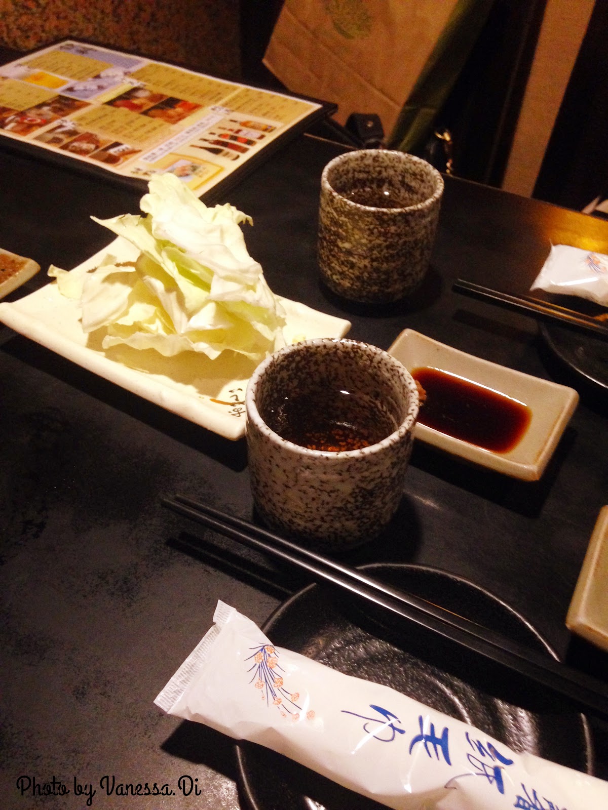 | 開胃小菜是生的高麗菜,搭配沾醬食用,吃起來格外鮮甜,開啟你那吃串燒的胃吧 |